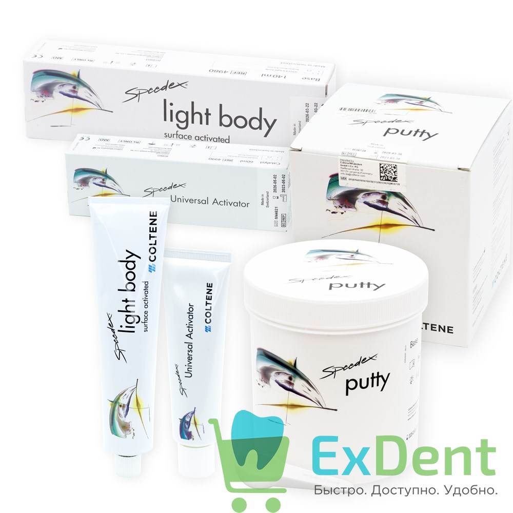 Speedex - слепочный материал на основе С-силикона премиум класса. Набор слепочной массы для базовых и корригирующих оттисков в комплекте с активатором. Подходит для одношаговой и двухшаговой техники двухслойного оттиска.